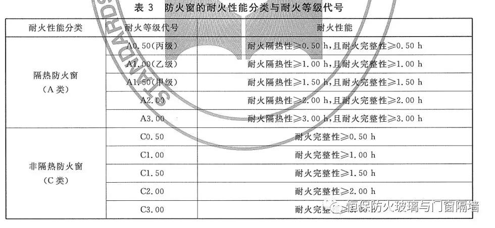 备注:根据国家标准《防火窗》GB16809-2008,甲级防火窗的耐火性能分类与耐火等级的规定:耐火隔热性≥1.50h,且耐火完整性≥1.50h的耐火等级代号是A1.50(甲级);耐火完整性≥1.50h的耐火等级代号是C1.50。所以我们常说的甲级防火窗是指耐火隔热性≥1.50h,且耐火完整性≥1.50h的防火窗。
