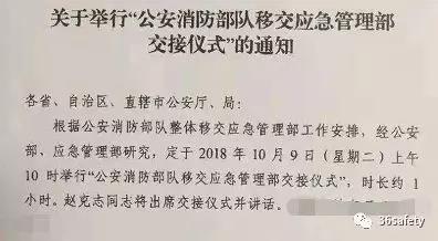 据多家媒体披露,根据公安消防部队整体移交应急管理部工作安排,经应急管理部、公安部部门研究,定于2018年10月9日(周二)上午10时举行“公安消防部队移交应急管理部交接仪式”,时长约1小时,公安部部长赵克志将出席交接仪式并讲话,主会场设在公安部机关楼。