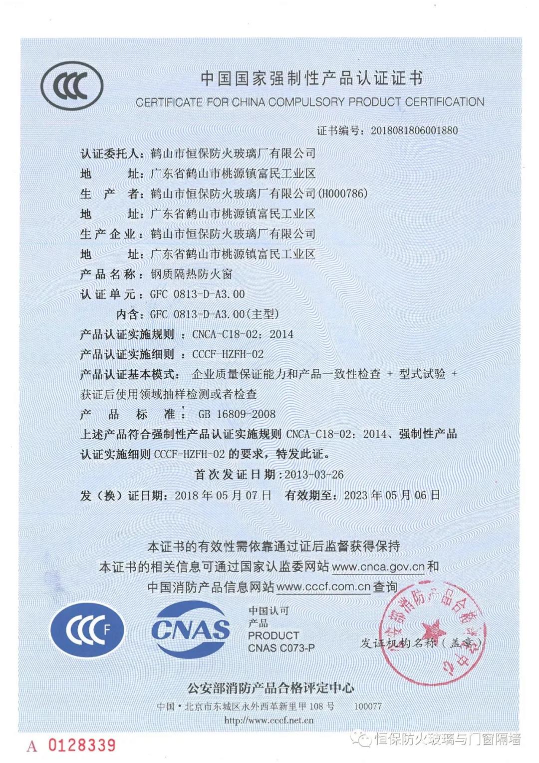 截止2018年10月,已获得国家“CCCf”主型产品认证证书36张,评定中心网上公告报告55份,四川中心公告26份,天津中心公告2份,英标、欧标、澳标、美标检验报告35份评估报告20份,耐火窗等其他性能测试报告16份,恒保公司共获报告154份涵盖0.5小时至4小时防火系列产品,并拥有防火玻璃与门窗类专利21项。