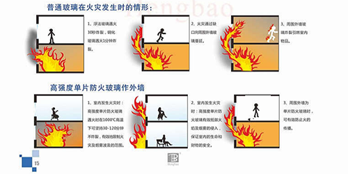 普通浮法玻璃遇火30秒炸裂,钢化玻璃遇火1分钟炸裂,不具备耐火完整性无法在一定时间内阻挡火势蔓延。而单片防火玻璃,遇火时在1000℃高温下可坚持30—120分钟不炸裂,有效地限制火灾以及烟雾波及的范围。