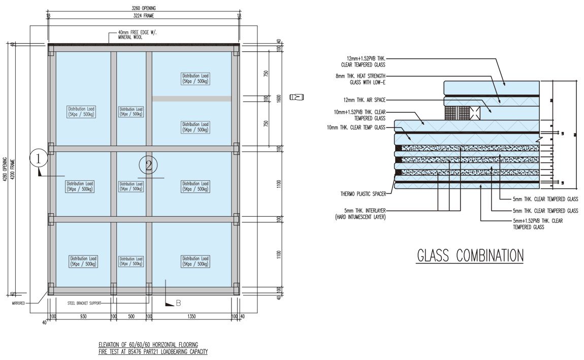 ★ 承重防火地台,天顶玻璃的测试
