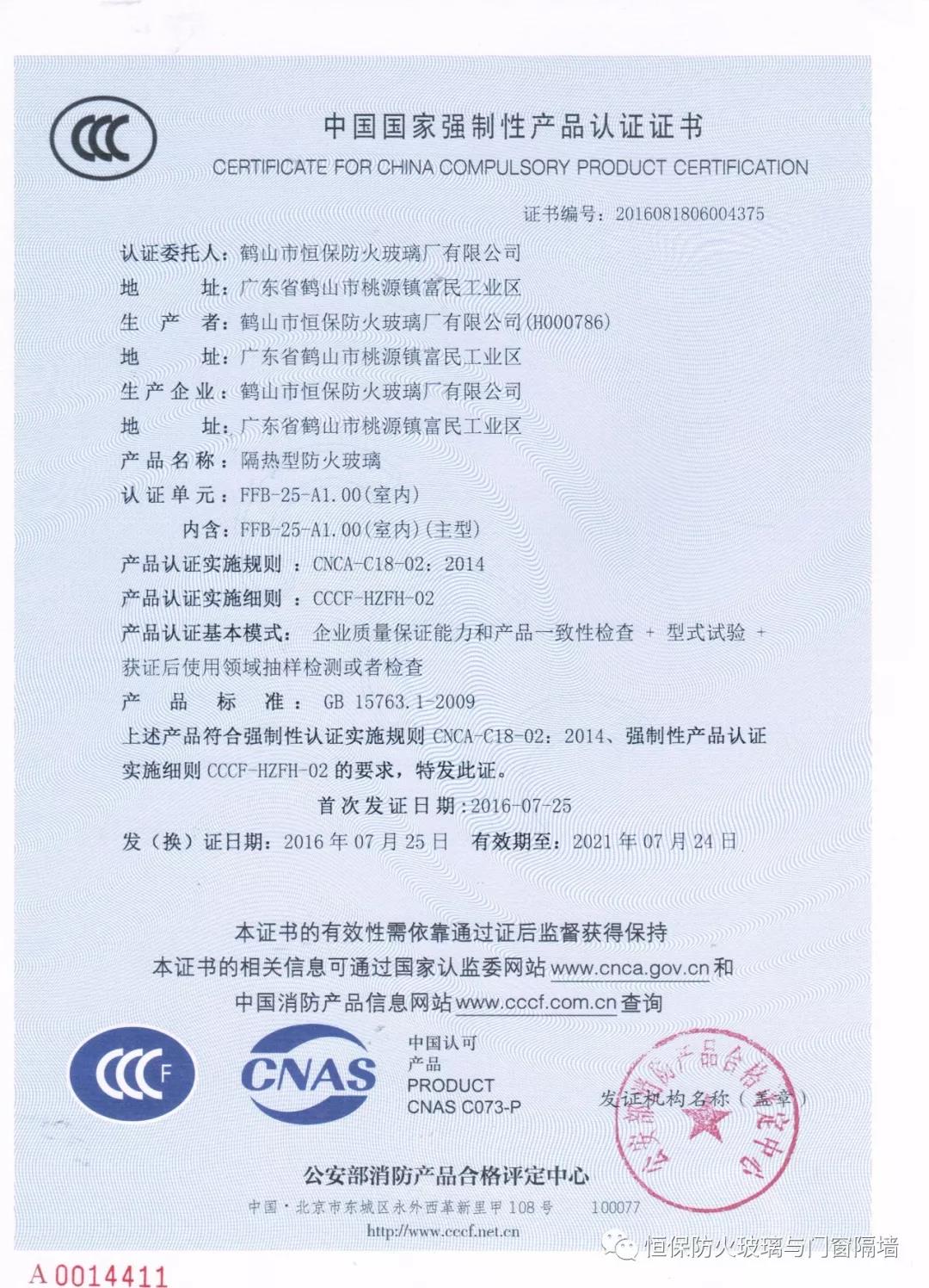 截至2017年7月,恒保已获得国家“CCCf” 主型产品认证证书31张,评定中心网上公告报告51份,四川中心公告11份,英标、欧标、澳标、美标报告29份评估报告18份,耐火窗报告4份,共计113份涵盖0.5小时至4小时防火玻璃系列产品,防火玻璃与门窗类专利17项。