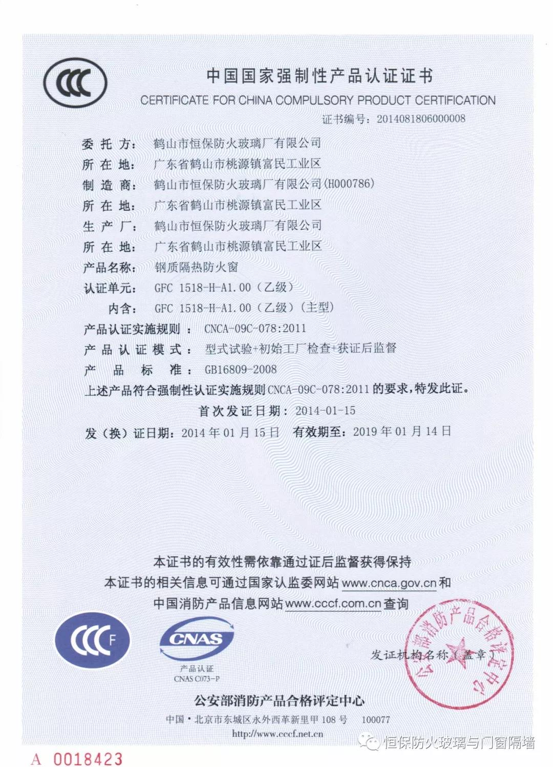 4.恒保公司一共12个产品获得国家3C认证证书,2小时和3小时钢质隔热防火窗更是国家首个通过国家认证的产品;