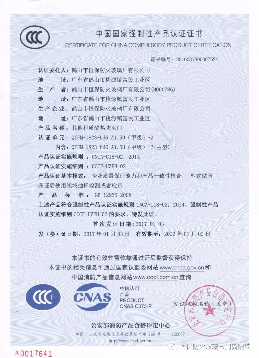 5、恒保公司一共6个产品获得国家3C认证证书,其中大版面玻璃防火门2100mmX3000mm